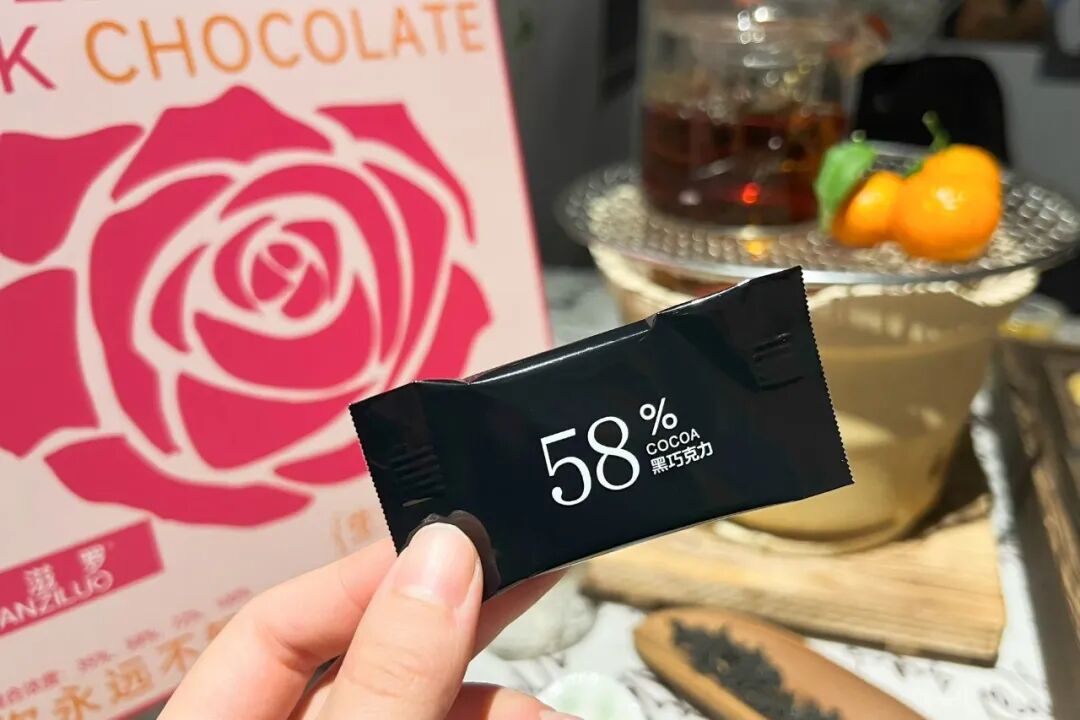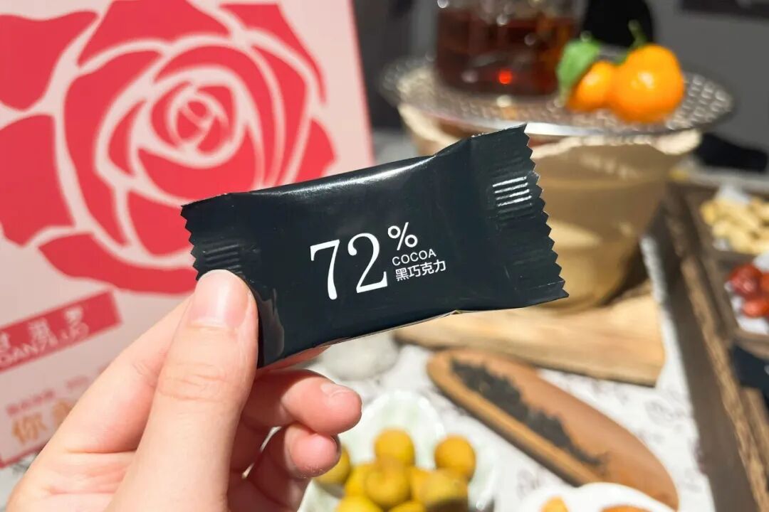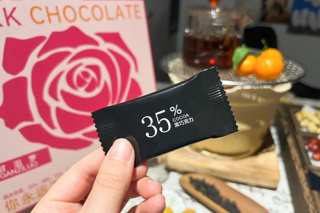 35%浓度,有明显甜味,回味能感受到可可醇香,是大部分人入门黑巧时不错的初级体验;